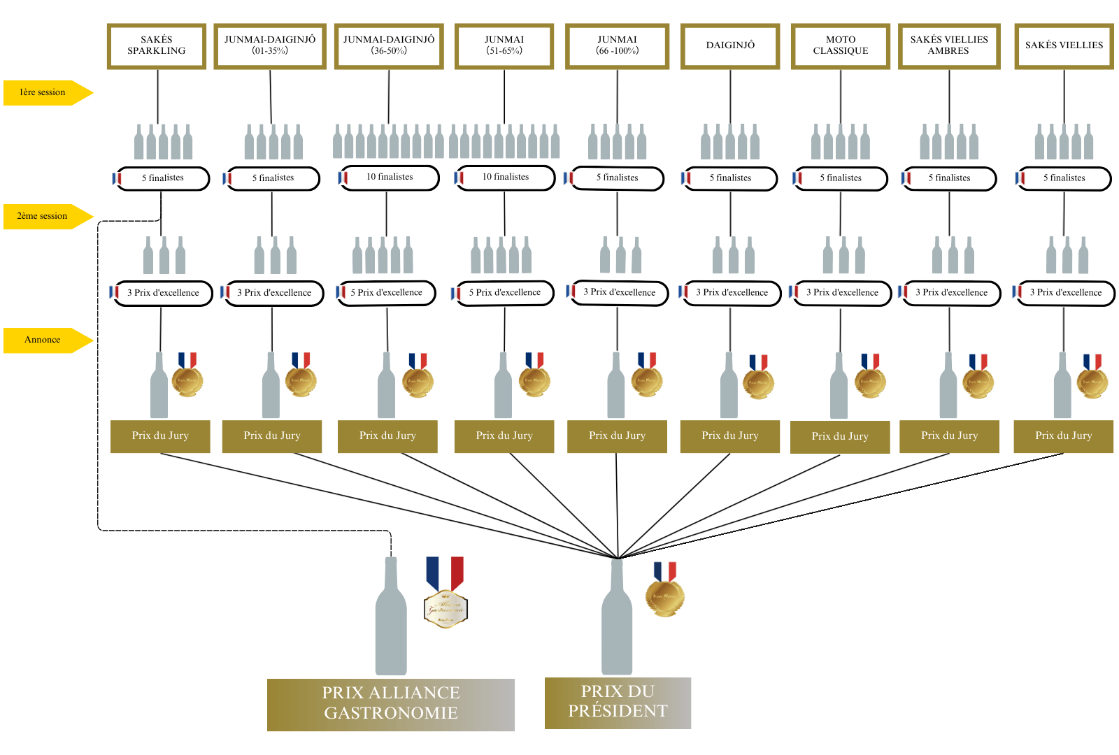 Toutes les boissons sont conservées à 5°C lors de leur transport entre le Japon et la France et sont servies à 15°C, dans des verres à vin (entre 8 et 10°C pour les sparkling). Le système de notation, sur une échelle de 100 points, sʼaxe sur des bases destinées au marché et au goût français. Les médailles dʼor récompensent les boissons ayant reçu entre 80 et 92 points, tandis que les médailles de platine sont conférées à des boissons auréolées dʼune note entre 93 et 100 points. Parmi ces dernières seront choisis les Prix du Jury et les Prix du Président. Le Prix du président sera décerné par le président du jury saké japonais, M. Xavier THUIZAT, à partir des Prix du Jury qui sont donnés par les membres du Jury pour toutes les catégories. Ce concours est organisé selon les règles stipulées par la DGCCRF et par conséquent, une récompense est accordée à 33% des boissons présentées.À l’occasion de la dixième édition de Kura master, nous aurons l’honneur d’accueillir, en tant que membre de notre jury spécial chargé de décerner le Prix Alliance Gastronomie, le grand chef Yannick Alléno, figure emblématique de la gastronomie française.