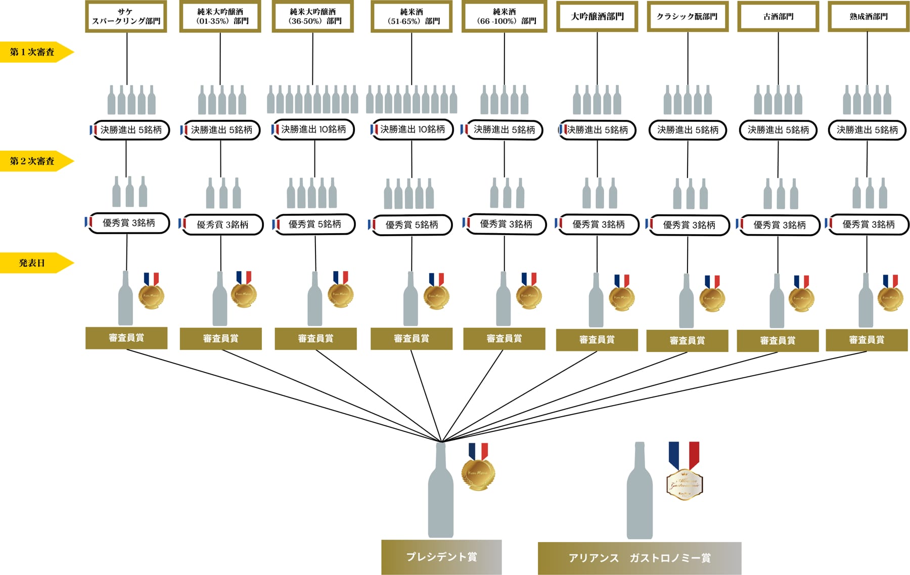 このコンクールは、フランス政府の競争・消費者問題・詐欺防止総局(Direction générale de la concurrence, de la consommation et de la répression des fraudes:以下「DGCCRF」)で定められている、提出された出品酒の総数の内、33%が受賞できるという規定に基づいて賞の決定がなされます。
