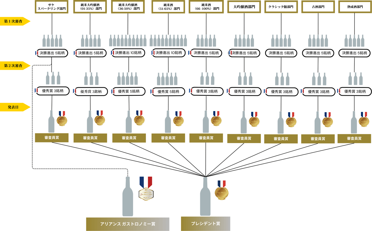 フランス人とフランスのマーケットに向けた審査基準となります。プラチナ賞は、100ポイントから93ポイント、金賞は、92ポイントから80ポイントまでとなります。プラチナ賞に選出された出品酒より、審査員賞、プレジデント賞が選出されます。各カテゴリーの最優秀賞である審査員賞は、審査委員会により選出、プレジデント賞は、Kura Master日本酒コンクール審査委員長であるグザビエ・チュイザが、全部門の審査員賞の中から選出した1銘柄に与えられます。