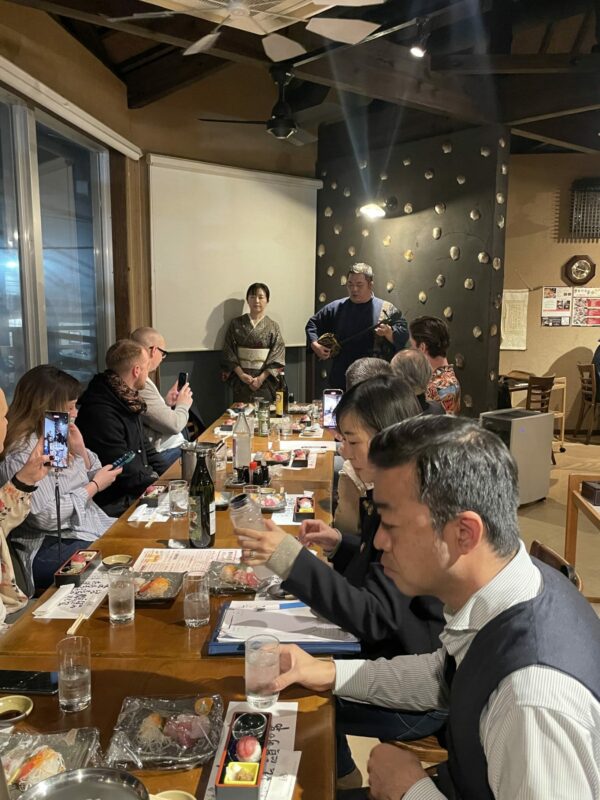 奄美の食事、黒糖焼酎を楽しみながら大島紬のお話や島唄、伝統的な楽器に触れ、審査員たちも長旅の疲れも忘れ、すっかり奄美大島のとりこになったようでした。