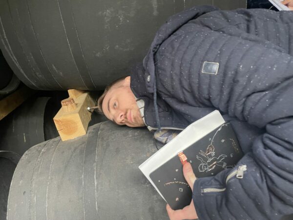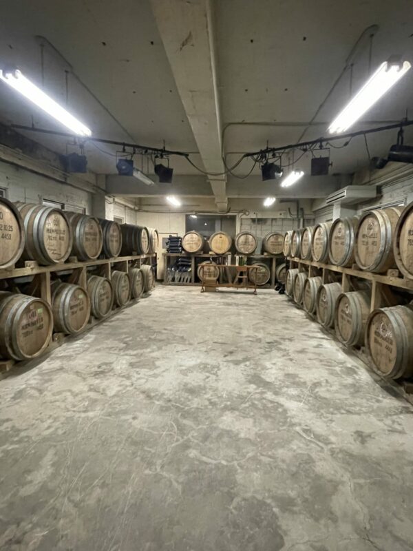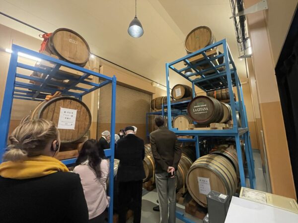 熟成用の樽庫は圧巻でした。樽について(どこの樽か、木の種類、新樽使用についてなど)、活発な意見交換がなされました。