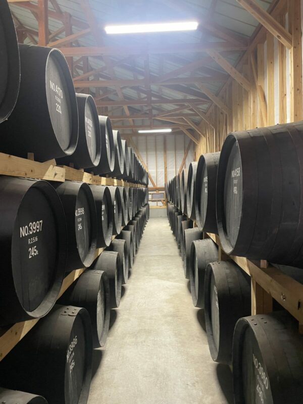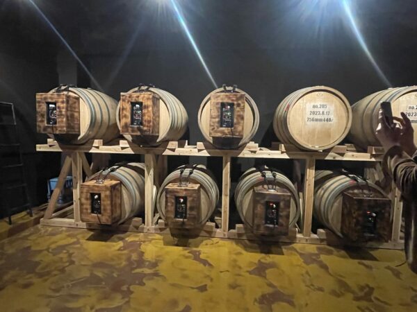 こちらにはスポットライトが灯り、ここはミュージシャンである西平さん一家が演奏する場所でもあります。熟成用の樽にはオークの他ミズナラや桜の木を使ったものもあります。
