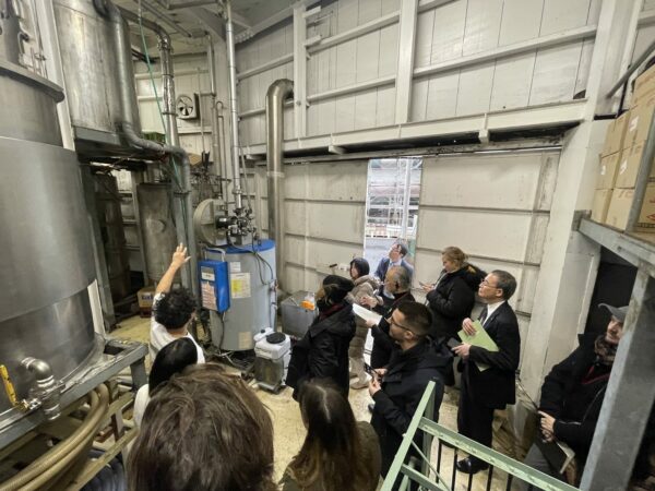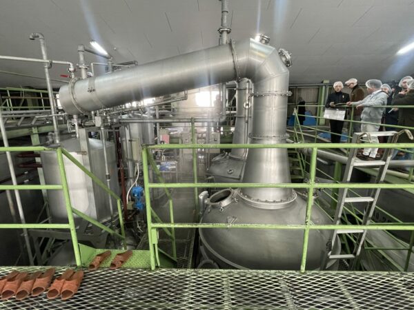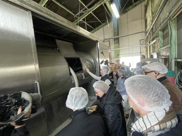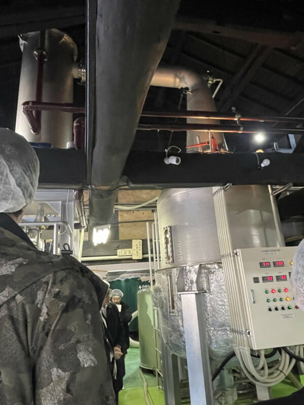 まず最初に奄美大島産の黒糖の新糖を溶かしている作業を見学しました。施設に足を踏み入れた途端、ふわっと甘い香りに包まれます。実際に黒糖を蒸気で溶かしている場面で温度や量について奄美大島産の黒糖にこだわり続ける狙いなど興味深く質問が出ていました。