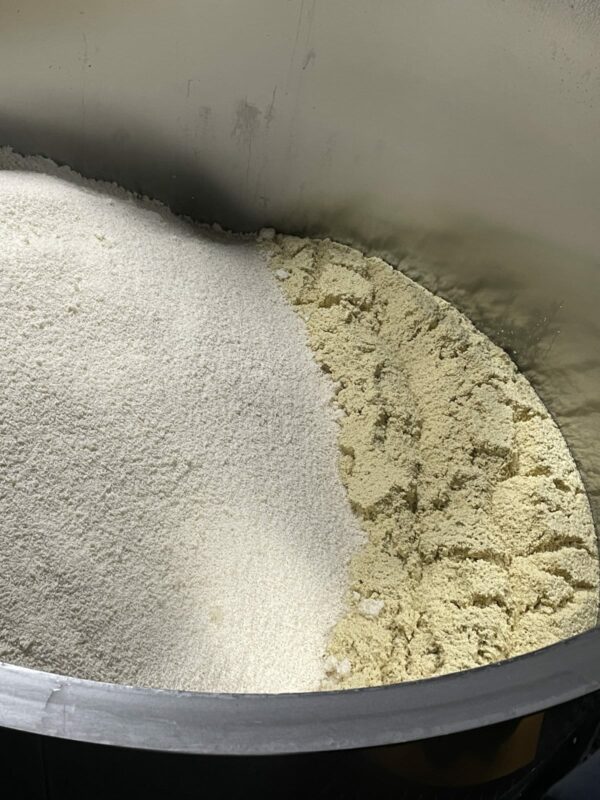 黒糖は通常溶かしてから二次仕込みに使用するのですが、こちらの蔵では固形のまま仕込む固形仕込みもしています。黒糖を溶かす際、熱を加えるとどうしても香りが飛んでしまうのですが、固形仕込みだともろみの熱で黒糖が解けるため全てのうまみや風味を液体に溶け込ませることができるのだそうです。しかし、固形仕込みだけで焼酎を作り、熟成をさせると辛みが出てしまうため、固形仕込みと液体仕込みの物をブレンドさせて商品にさせるそうです。