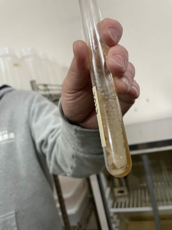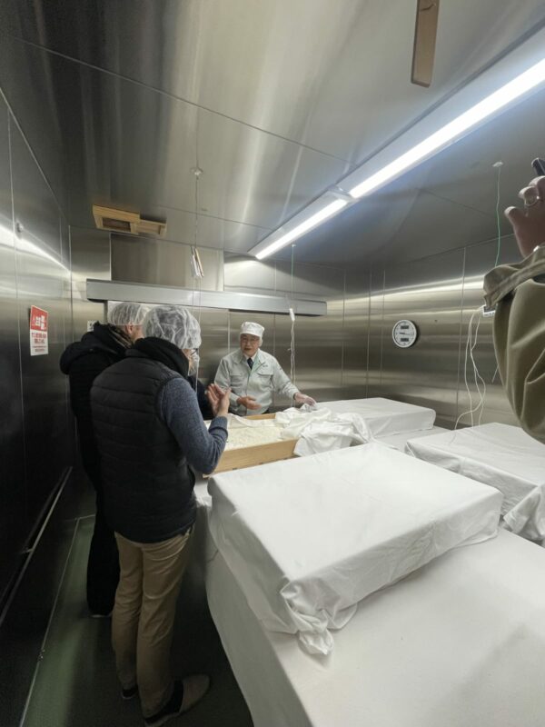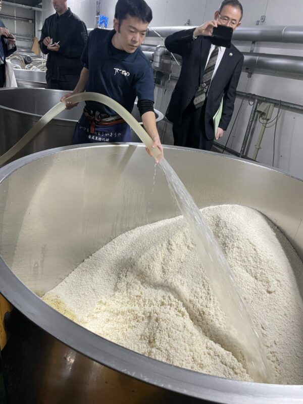 一行が訪問した時期はちょうど大吟醸の仕込み中。焼酎と違い、日本酒では黄麹を使用することが多い点に審査員たちも興味を持っており、黄麹というが黄緑色なのはなぜか、などの質問がありました。黄麹は菌がしっかり育つと黄緑になるそうです。