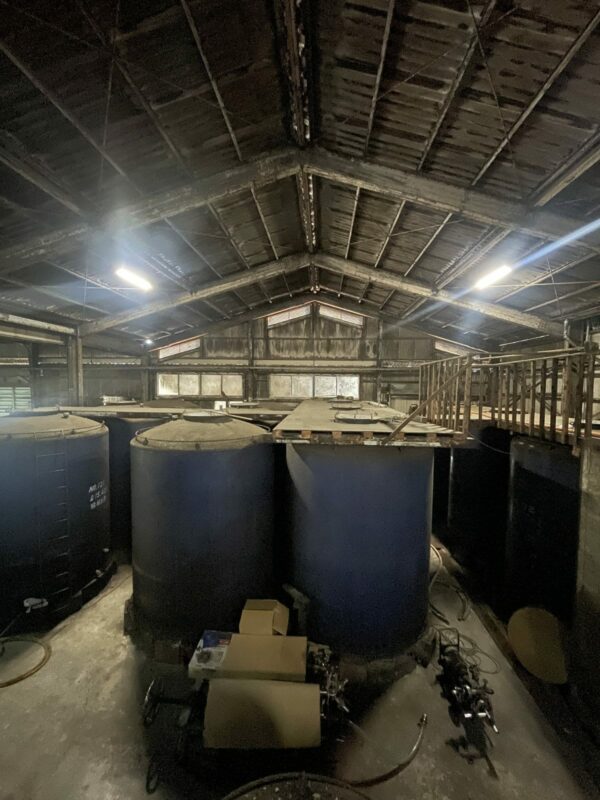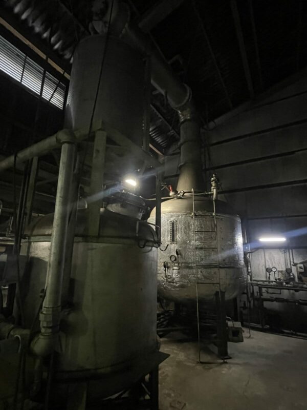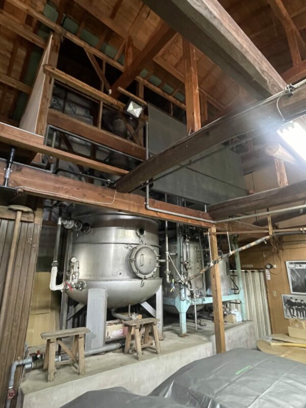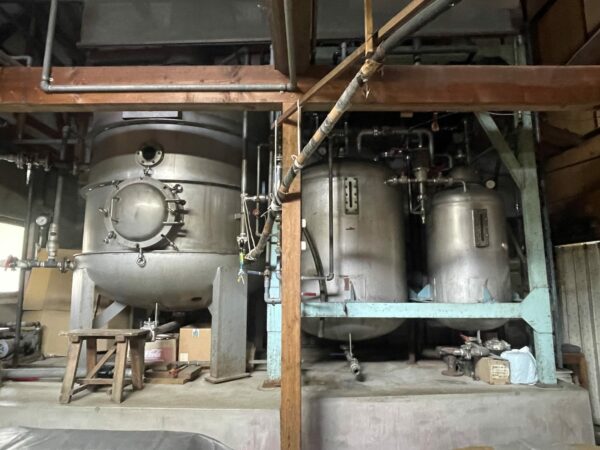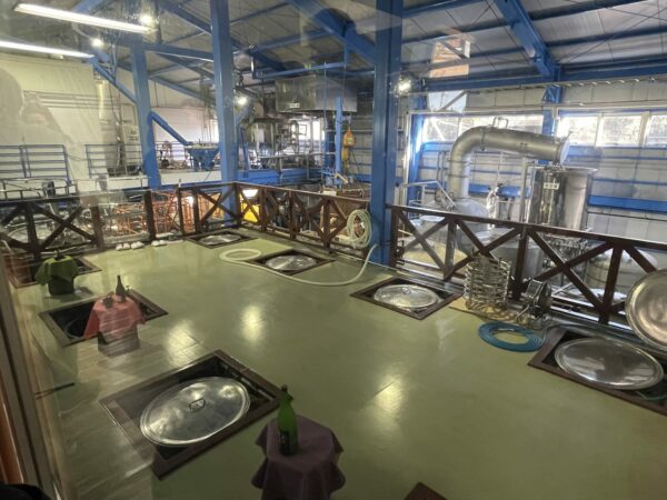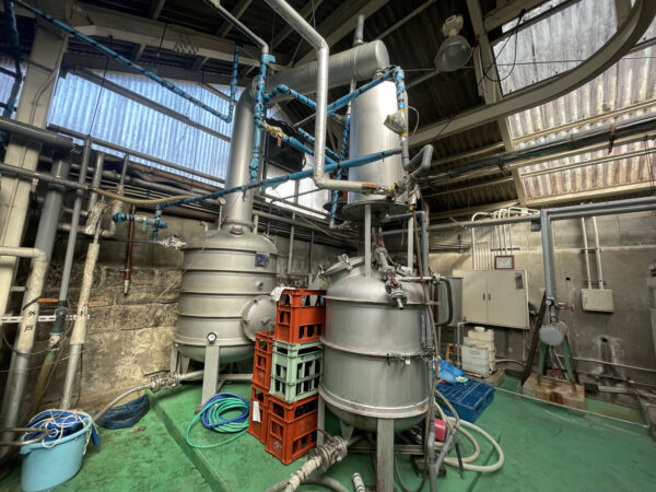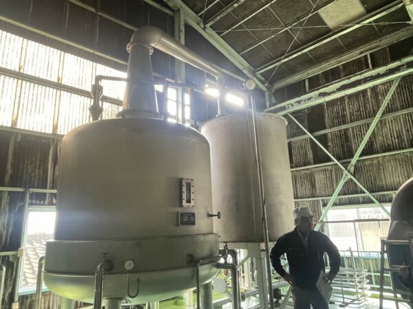 続いて、いよいよ黒糖を投入する行程。黒糖の風味を損なわないようにゆっくり蒸気で溶かして米麹:黒糖の割合を1:2ににしてもろみに投入します。それから12日間発酵が続きます。発酵温度は一次仕込みとあまり変わりませんが、33度ほどで進みます。ここでは大きな泡がブクブクと立ったタンクとそうでないタンクがあり、この違いなどを質問しました。