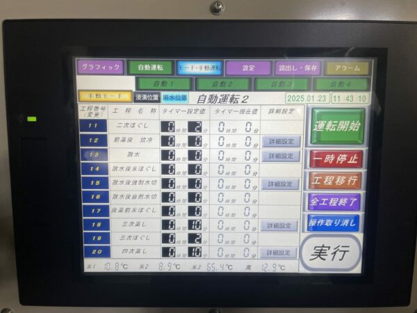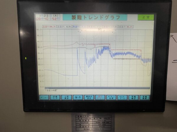 このドラム式製麹機で洗米、浸水(吸水率20~25%)、蒸きょう、麹の種付けを行います。審査員たちは、米麹にはタイ米を使用する理由や麹の色の違いなどについて詳しく質問をしていました。