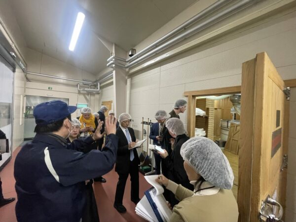 弥生焼酎醸造所に到着すると、九州経済産業局、国税局、地方新聞社の取材の方々に歓迎を受け、川崎洋之社長にご案内いただきました。
